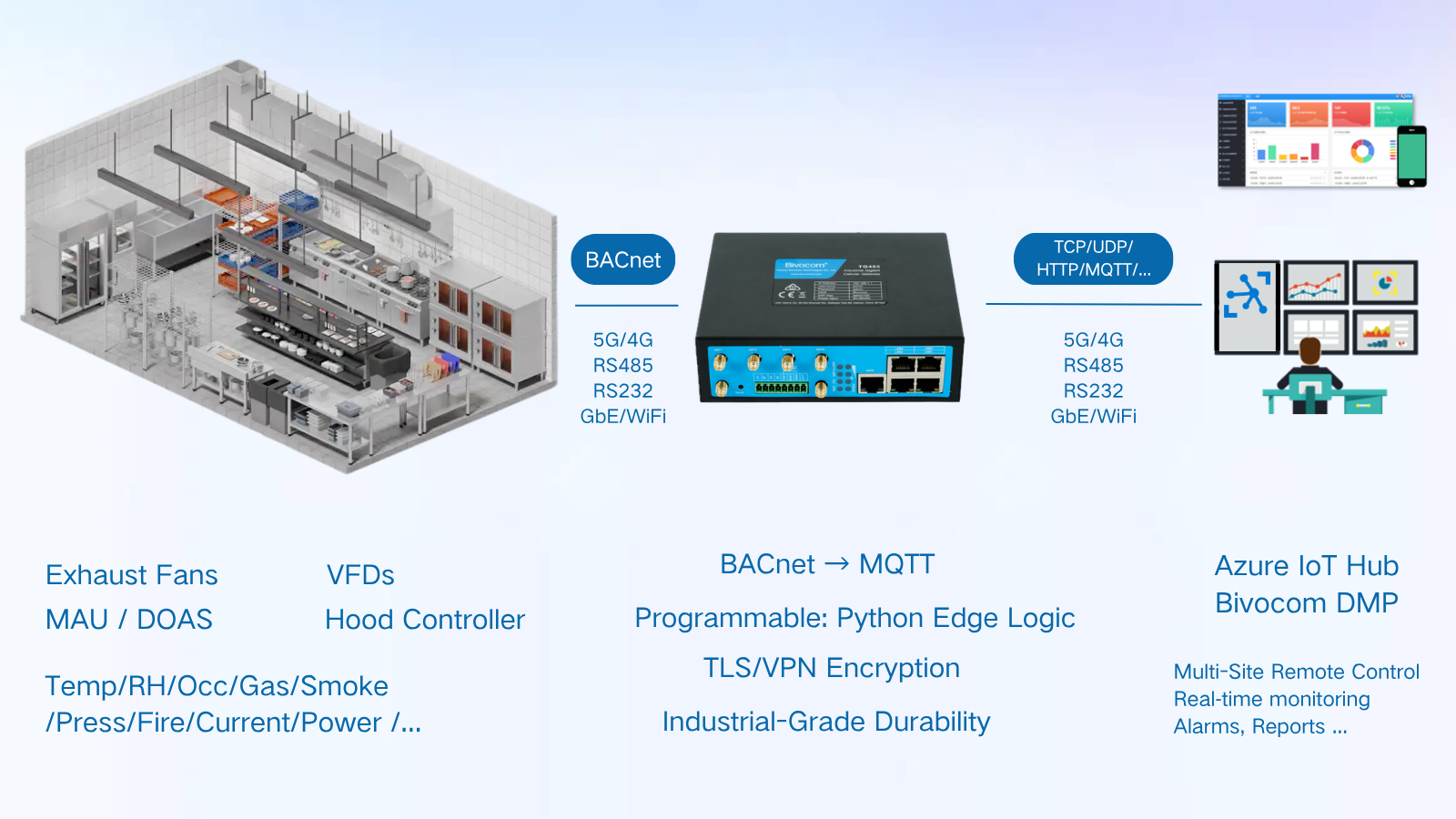 Commercial kitchens are among the most energy-intensive spaces in any building. Most kitchen ventilation systems run at full speed regardless of actual cooking activity—a massive waste that facility managers have learned to accept. Achieving true efficiency requires intelligent connectivity between temperature sensors, smoke detectors, HVAC controllers, and cloud analytics. Bivocom‘s TG453  is engineered specifically as a BACnet IoT Gateway for Smart Kitchen HVAC, supporting native BACnet MS/TP and BACnet/IP connectivity, Python-based edge control, secure MQTT TLS transmission to Azure IoT Hub, and industrial-grade performance built for harsh kitchen conditions—turning your kitchen from an energy liability into a smart, efficient asset.