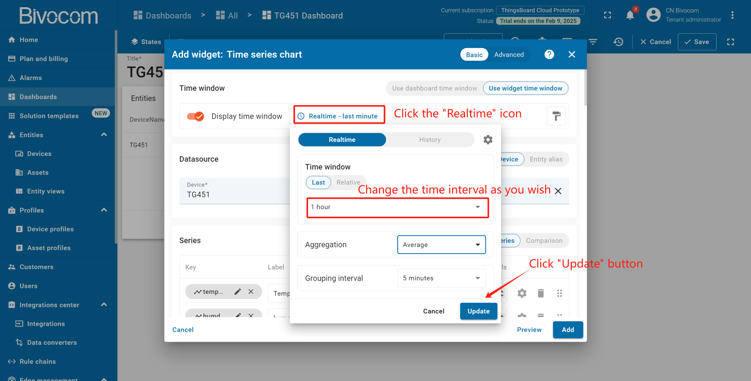 Specify the previously created device “TG451” as the data source in the “Device” field. In the “Series” section, specify the data key to start monitoring the telemetry values of the device. Click the “Realtime”, select the specific time interval from the drop-down menu, and click “Update” to save the change. Then click “Add” button. Resize the widget, and save. New telemetry readings will display in the chart in real time for the set time interval.