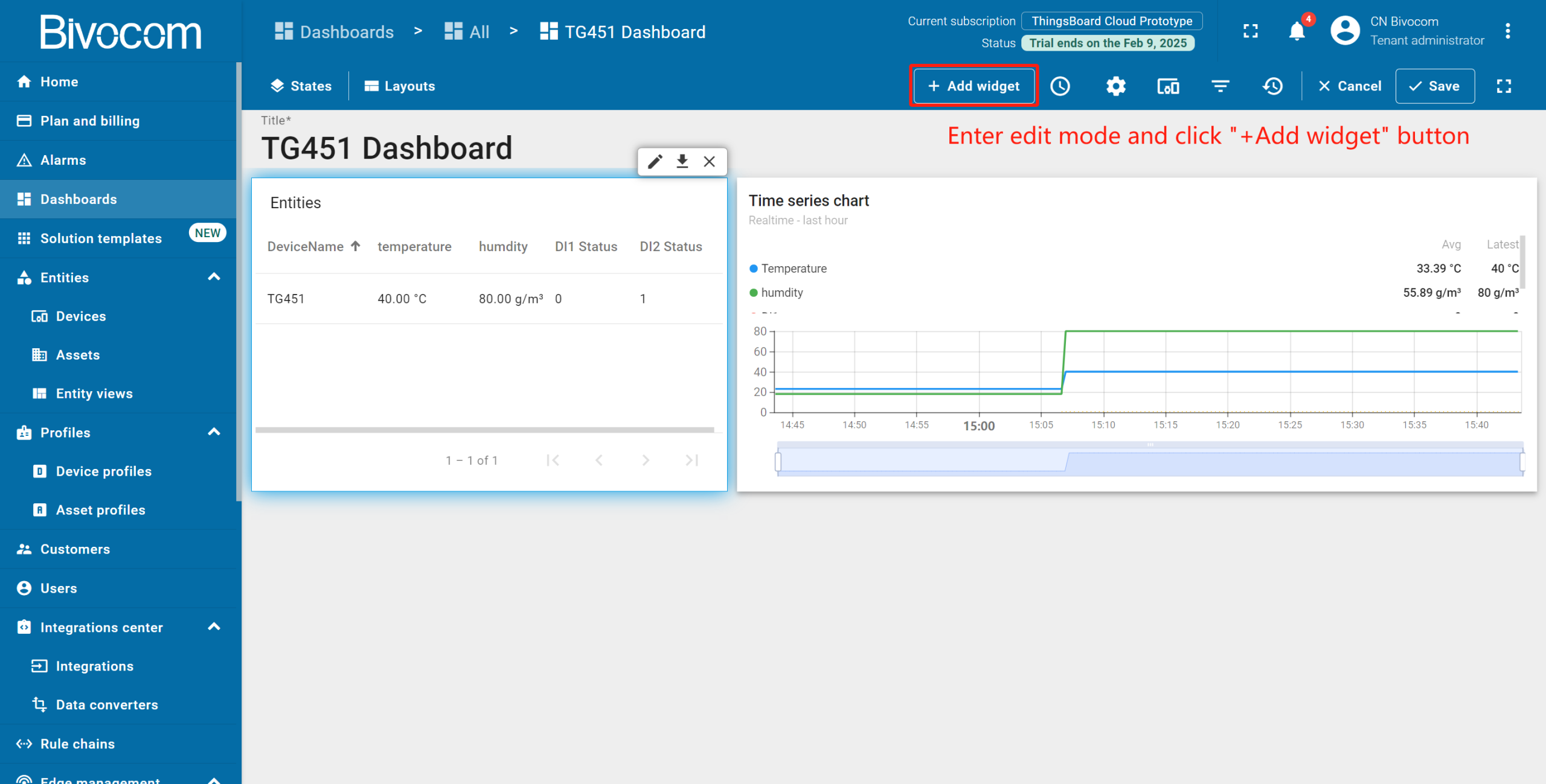 Navigate to your Bivocom ThingsBoard Dashboard and enter “Edit mode”. Click “Add widget” (top) or “Add new widget” (center, for empty dashboards) → “Tables” bundle → select “Entities Table”.