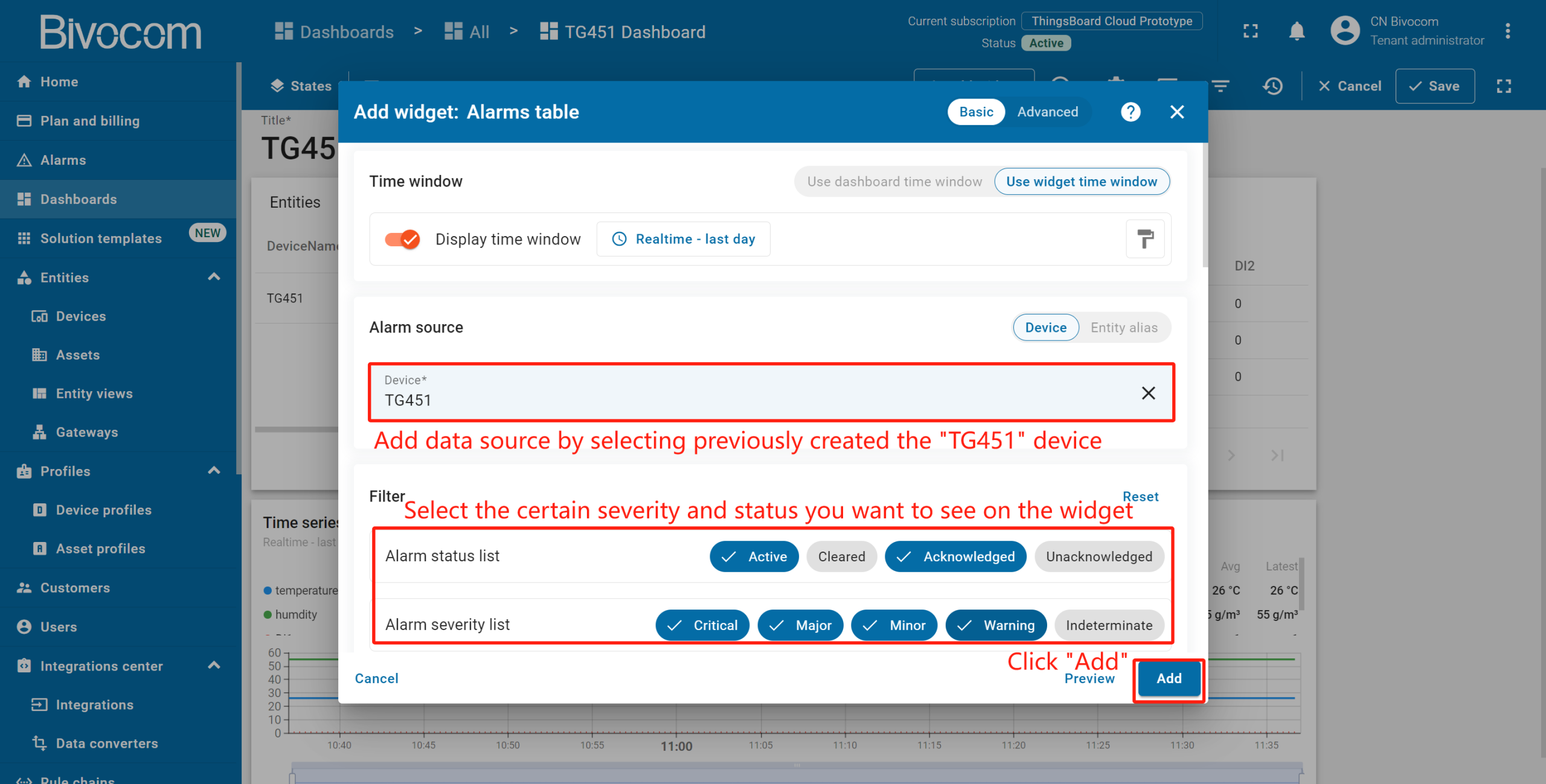 Set your Bivocom device as the data source → configure the filters. All alarms have specific severity and statuses. Mark those you want to see in the widget (unmarked filters display all alarms, regardless of severity/status). By default, widgets stack vertically. Drag the “Alarms” to free dashboard space, resize it to your needs, then click “Save” to apply changes.