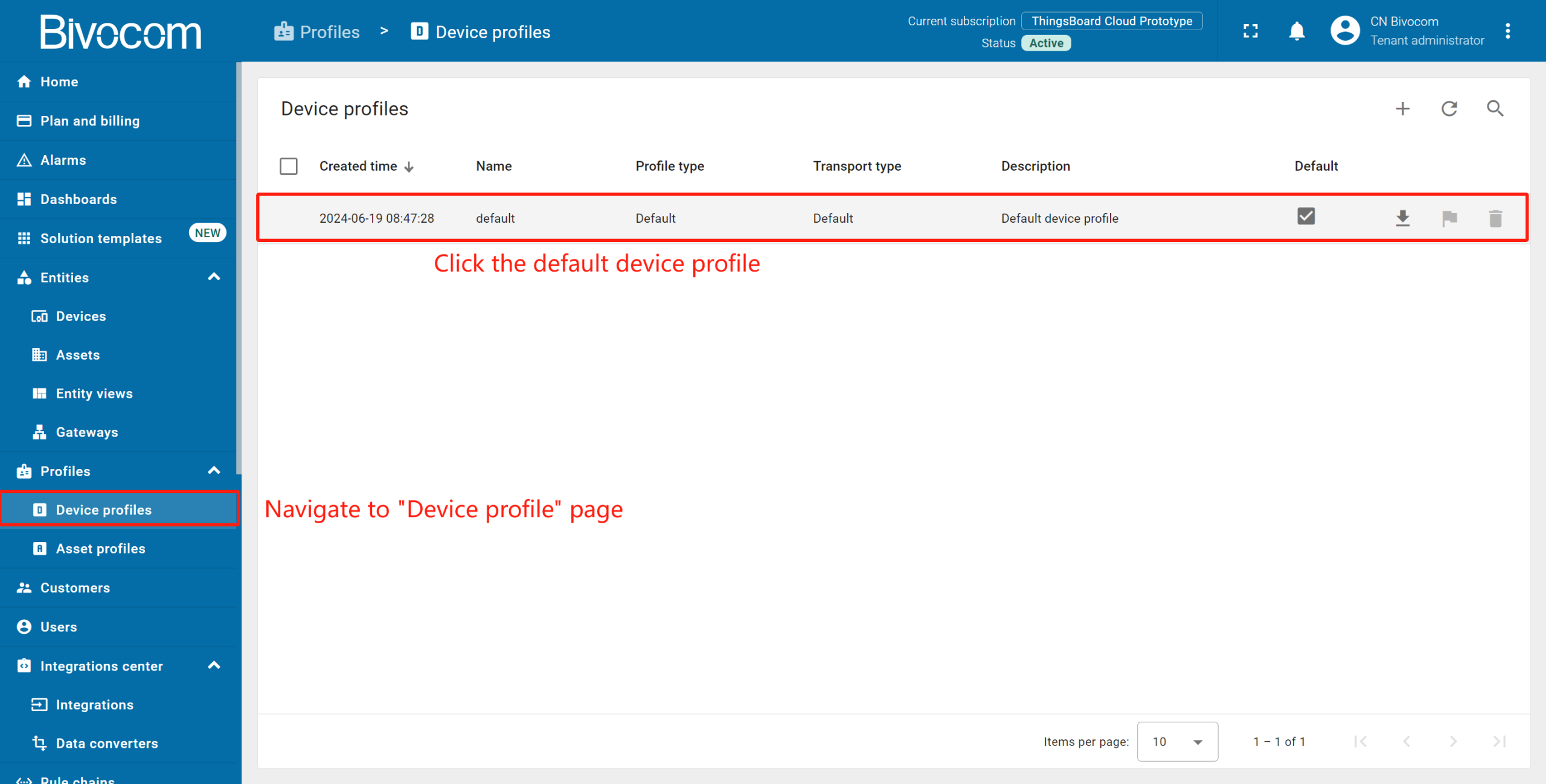 Navigate to “Device profiles” page of the “Profiles” section. Then click on the default device profile row to open its details.