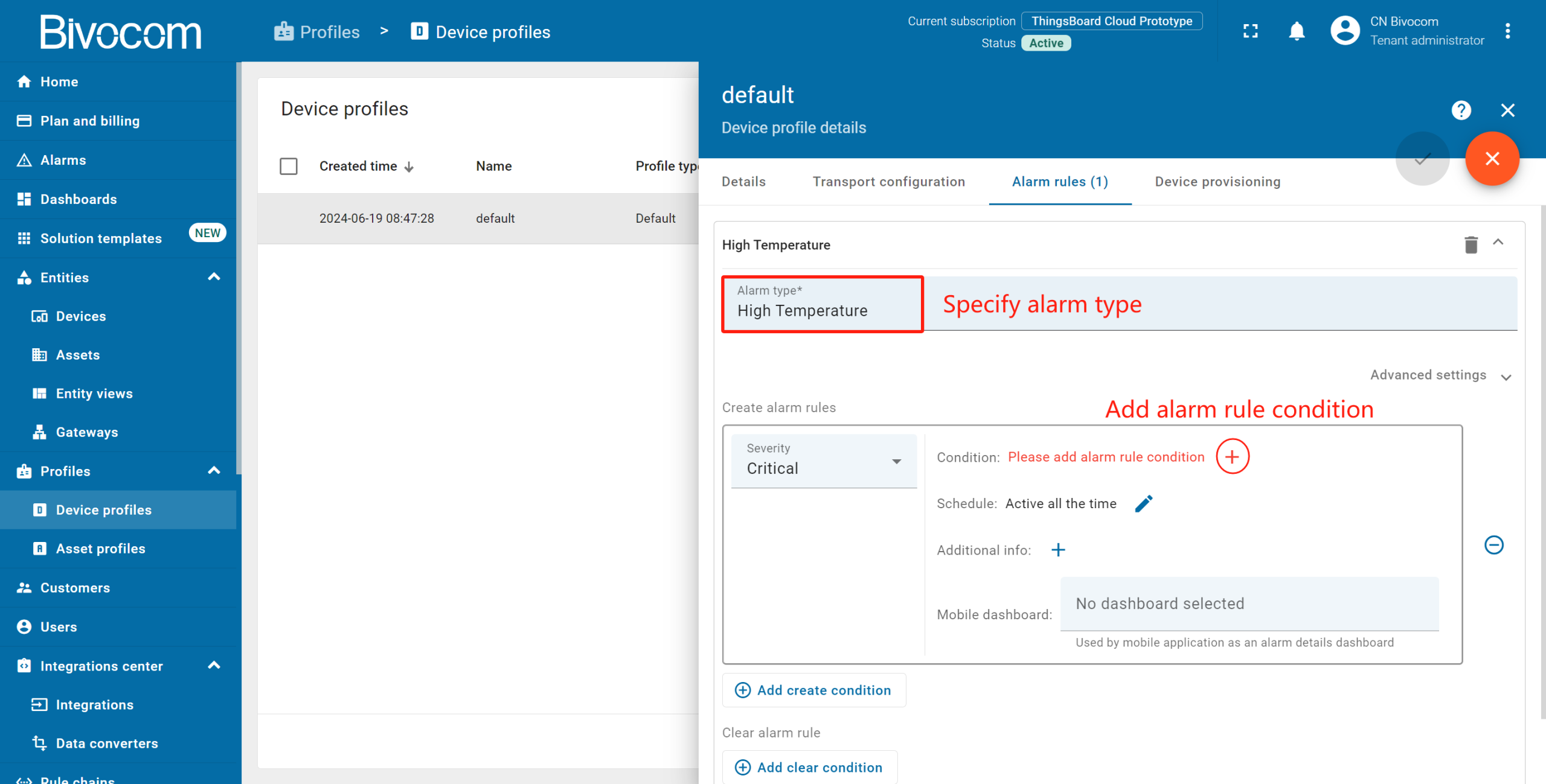 Leverage ThingsBoard’s alarm rules feature to trigger automated alarms when telemetry data reaches a certain value. For this purpose, we should edit the device profile and add a new alarm rule. In this case, my created device is using the “Default” device profile.