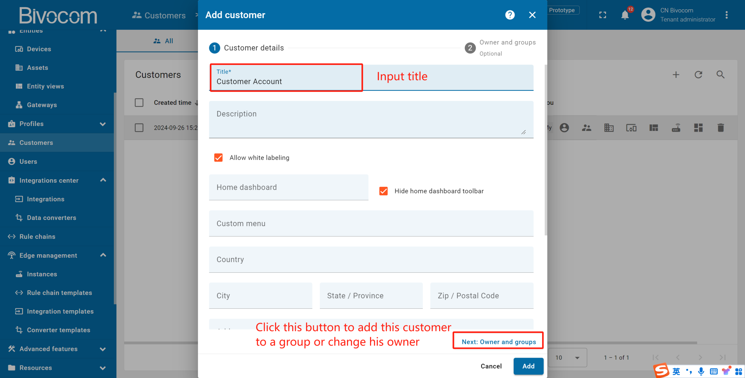 Input the customer title. Additionally, you can input personal details for the customer and assign a home dashboard. To finalize the creation, you can click the “Add” button. In this case, the new customer will be created and located in the “All” customers folder. Let`s create a separate group for our customer. To do this, click on “Next: Owner and groups”.