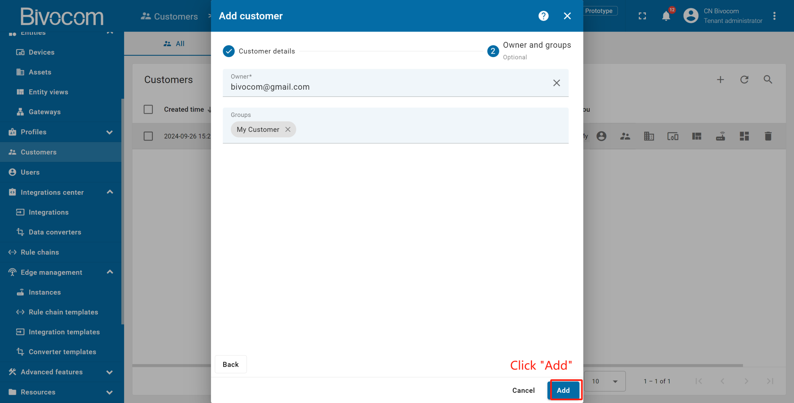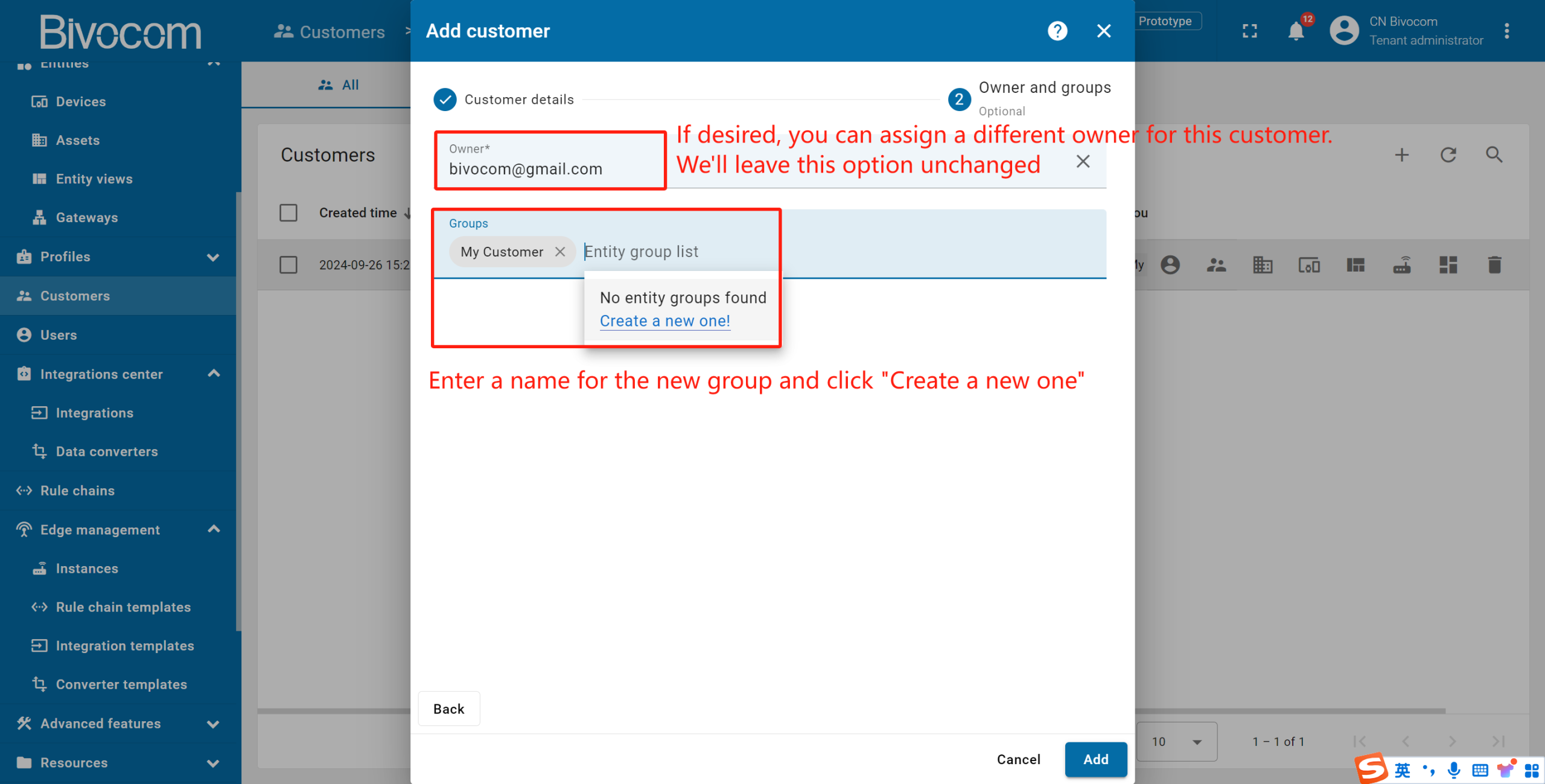 Let’s assign the Customer as the owner of the device. We will also create a group of devices and add our device to this group.