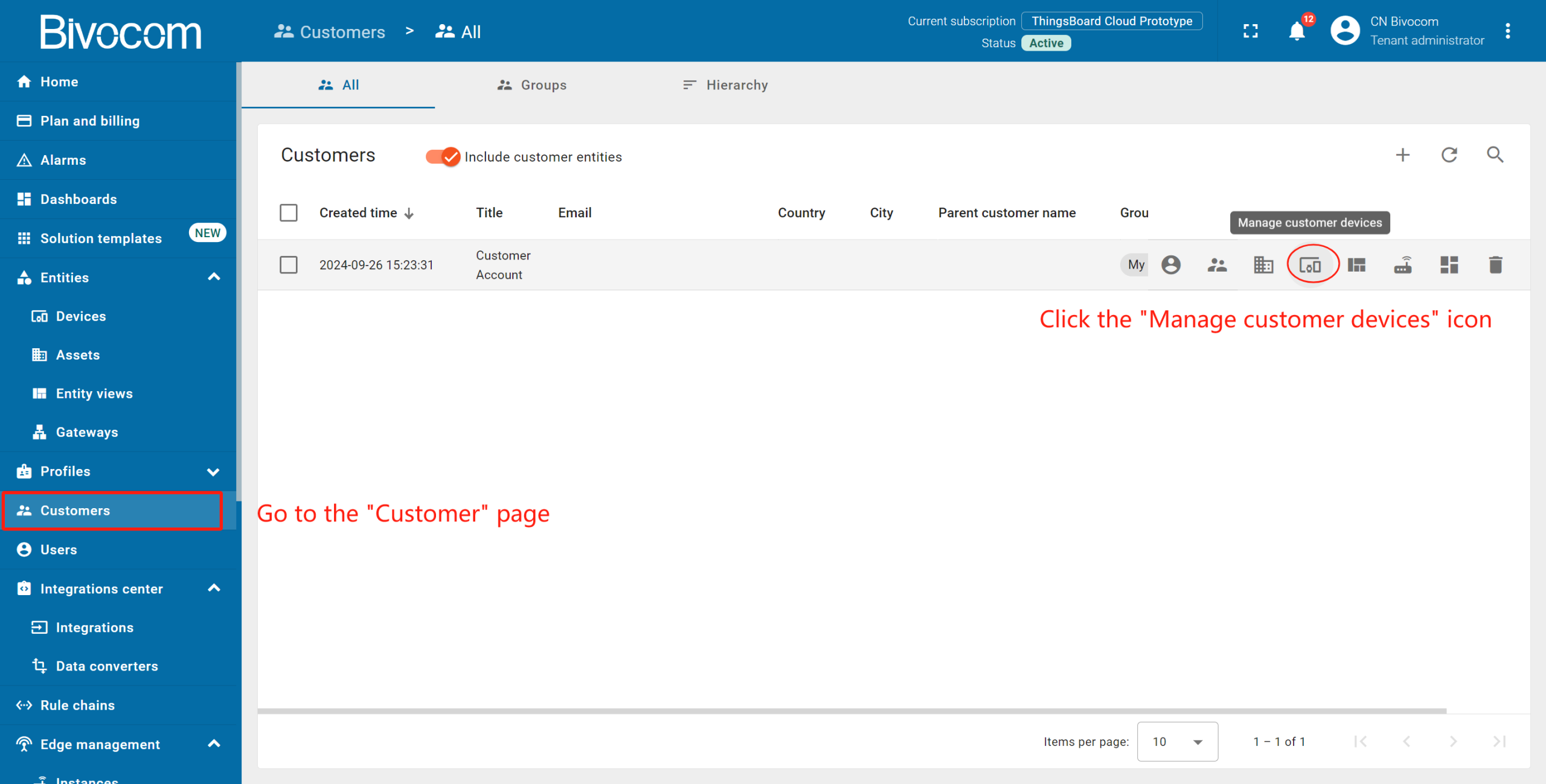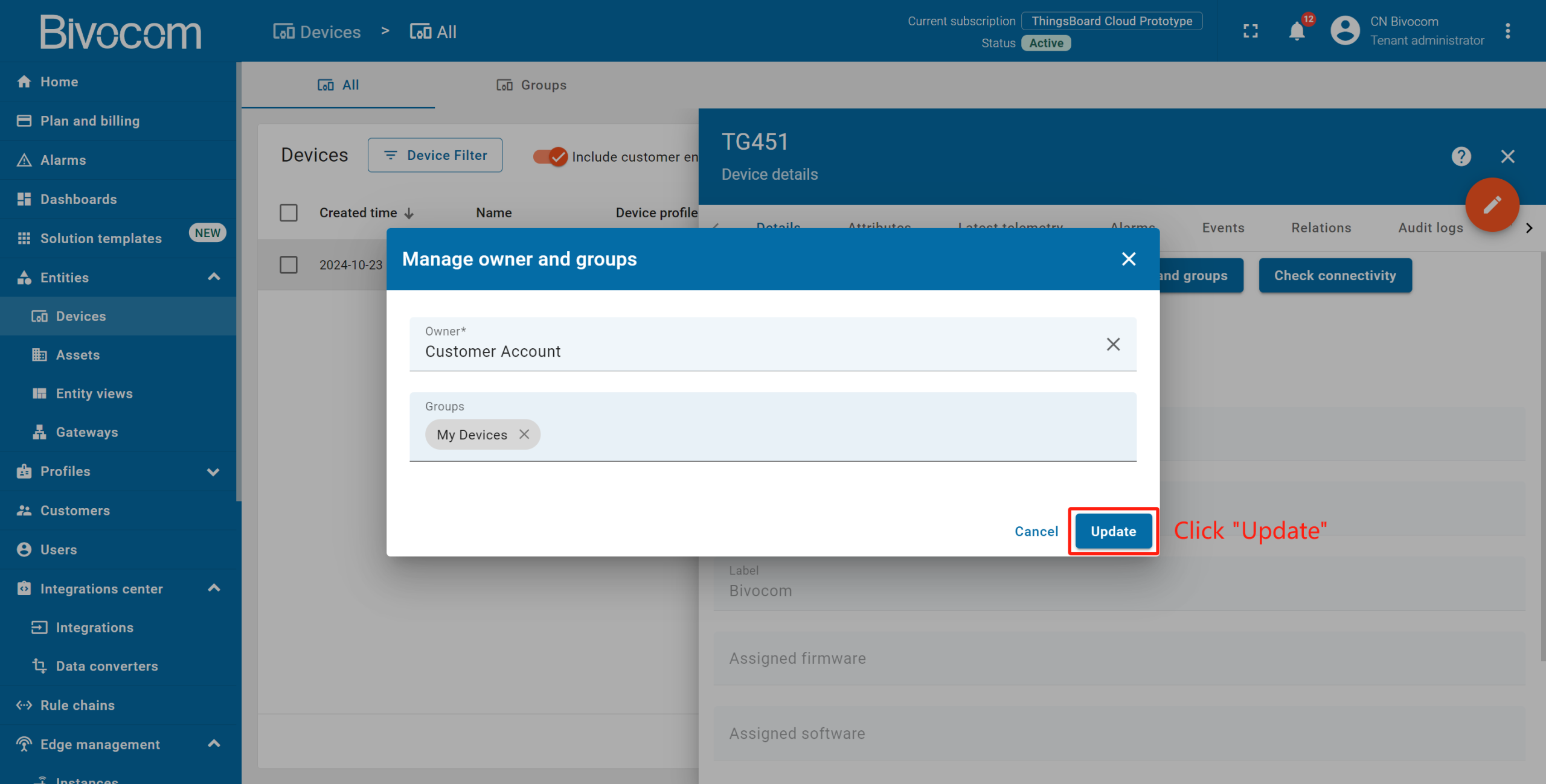 Verify the assignment: Navigate to “Customers” > [Your Customer] > “Manage customer devices”—your Bivocom device will appear in the “My Devices”.
