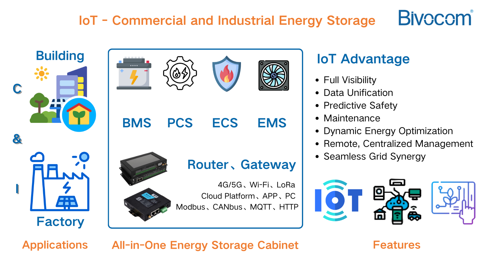 Bivocom leverages deep Industrial IoT expertise and a global footprint to provide reliable connectivity for critical energy infrastructure. We integrate rugged hardware (GNSS/LoRa/5G routers, gateways, and RTUs) with adaptable software platforms, directly addressing key challenges in the energy sector. Our solutions transform standalone C&I Energy Storage Cabinets into intelligent, data-driven nodes within a wider energy network.