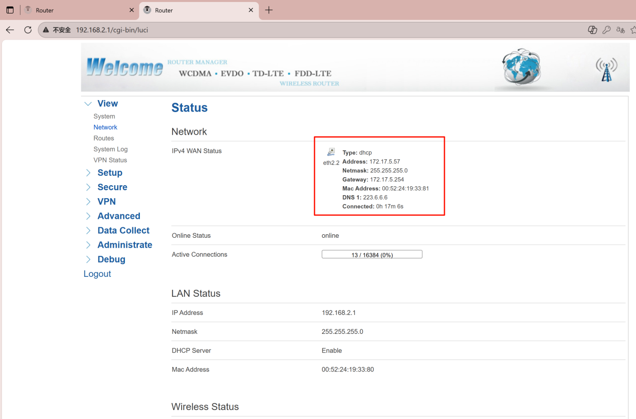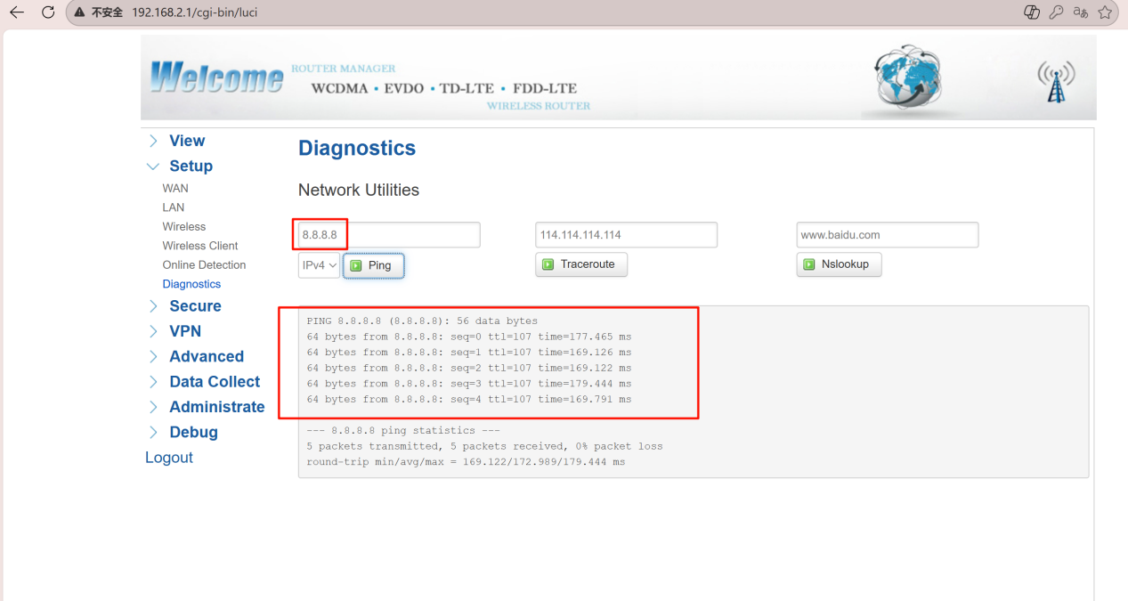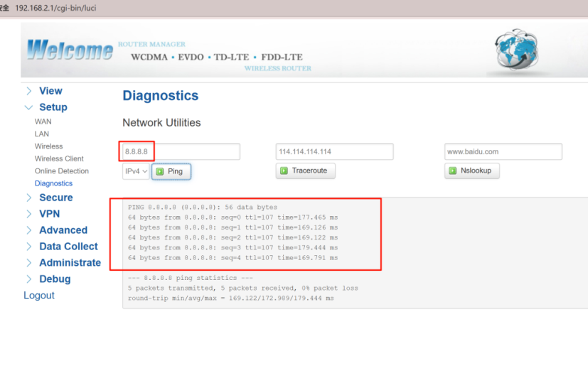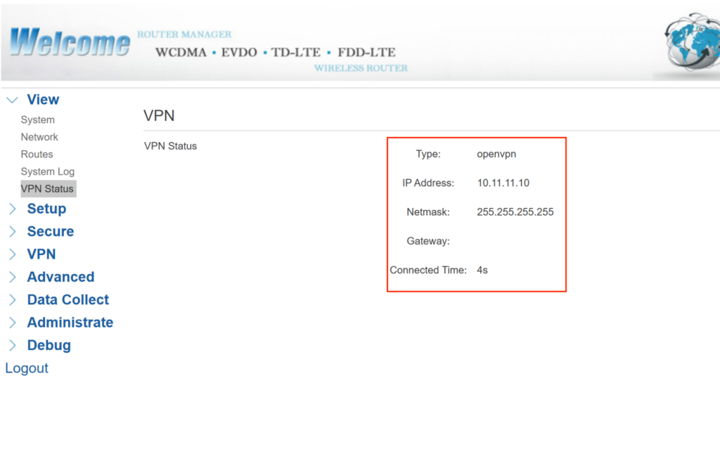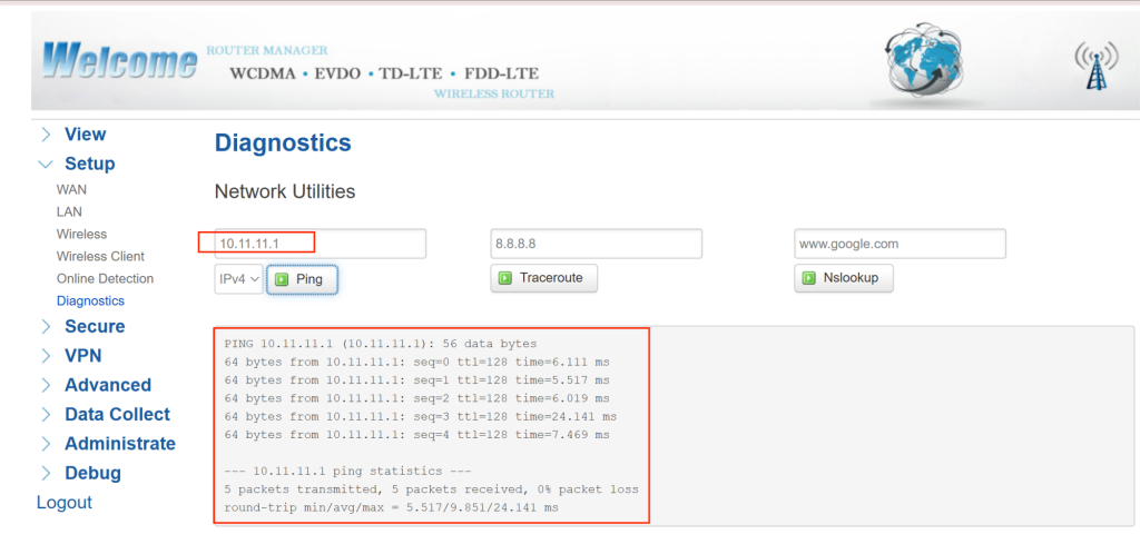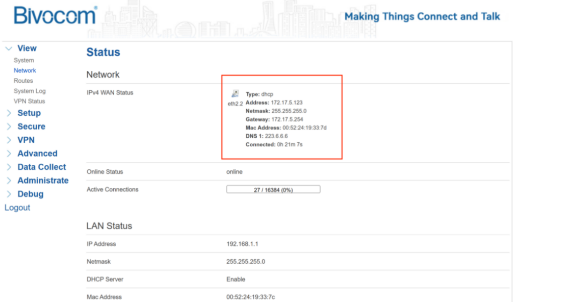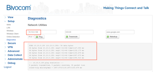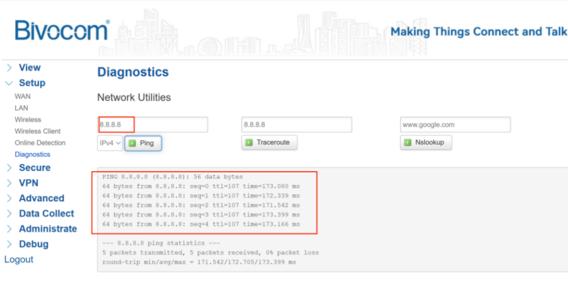 Log into your Bivocom router’s web UI. Go to View > Network and verify the IPv4 WAN status. Confirm the device has a valid IP address, gateway, and DNS. Run a ping test to an external IP (e.g., 8.8.8.8). A successful reply means your WAN link is ready for OpenVPN.