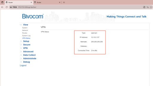 To verify that the VPN tunnel allows device‑to‑device communication, set up another Bivocom router as a second client. Repeat the same steps on a second device (Client2):