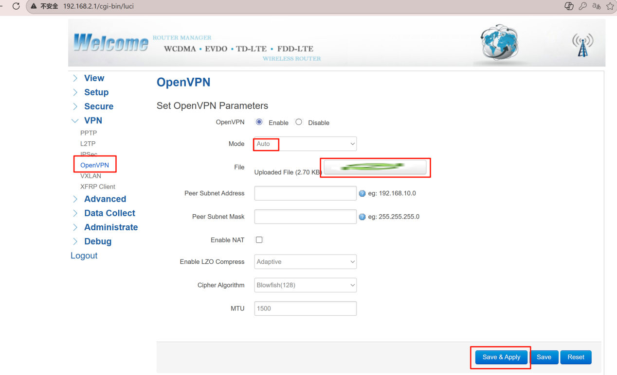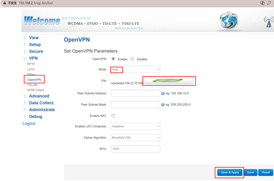 - Navigate to VPN > OpenVPN. Enable the OpenVPN feature, select Auto mode, upload the .ovpn file, then click Save & Apply.