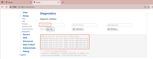 Enter the device WEBUI and ping the server’s tunnel IP(10.11.11.1). And access the device via CLI to check the network interface.