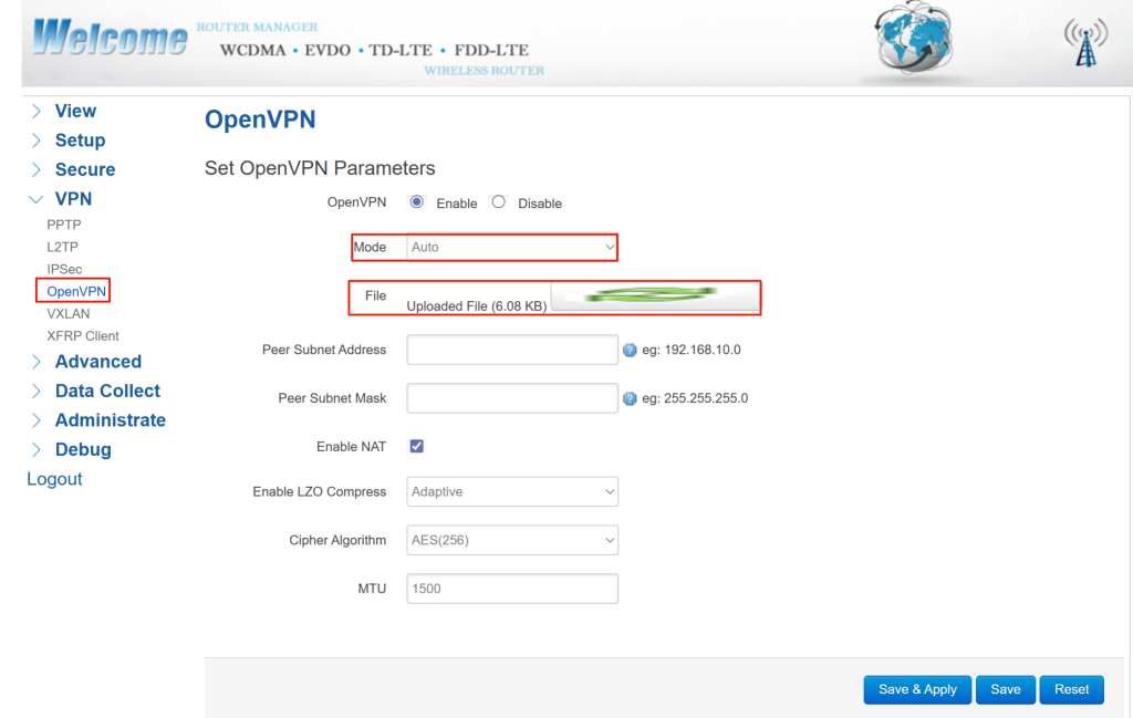 Auto‑mode, you simply upload a complete .ovpn file. The router extracts all necessary parameters – remote server address, port, protocol, encryption ciphers, certificates, and keys – automatically. This makes auto‑mode remarkably fast and error‑resistant. You do not need to understand every OpenVPN directive. It is ideal for large‑scale rollouts, field upgrades, or situations where the VPN configuration comes from an IT team or a VPN service provider.