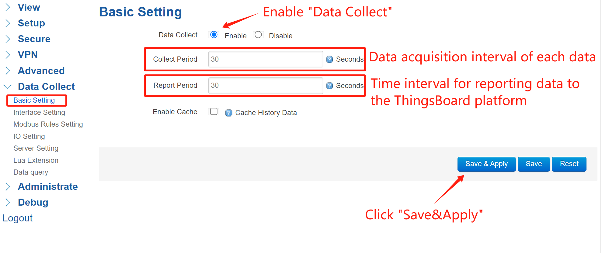 ① Basic Settings: Navigate to Data Collect > Basic Setting.Toggle “Data Collect” to enable, then set your desired collect and report intervals. Then click “Save&Apply”.