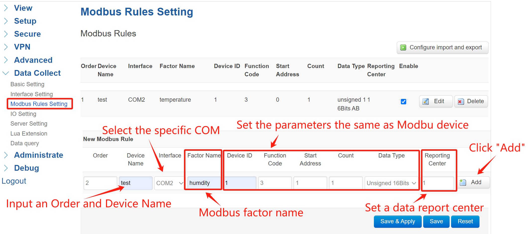 ① Define Protocol Rules: Navigate to Data Collect > Modbus Rules Setting and click “Add” to create a new rule.
