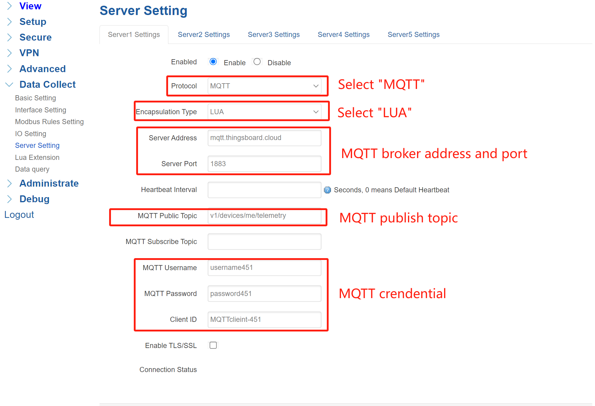 Navigate to Data Collect > Server Setting. You can configure up to 5 data report servers. Enable a server setting, “Protocol” select “MQTT”, “Encapsulation Type” select “LUA”. MQTT Server Address: “mqtt.thingsboard.cloud”, Server Port: “1883”. Set MQTT parameters according to ThingsBoard setting.