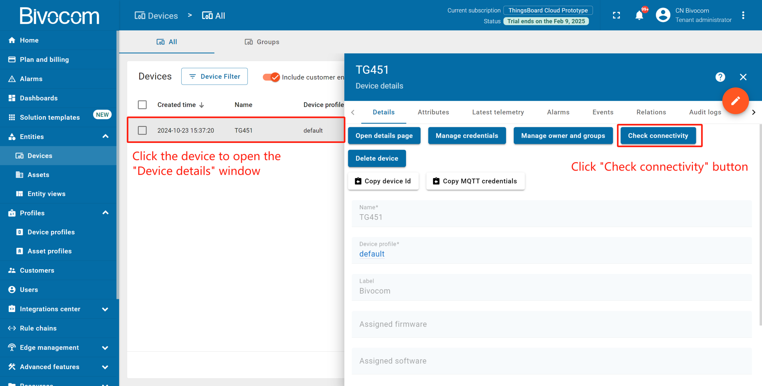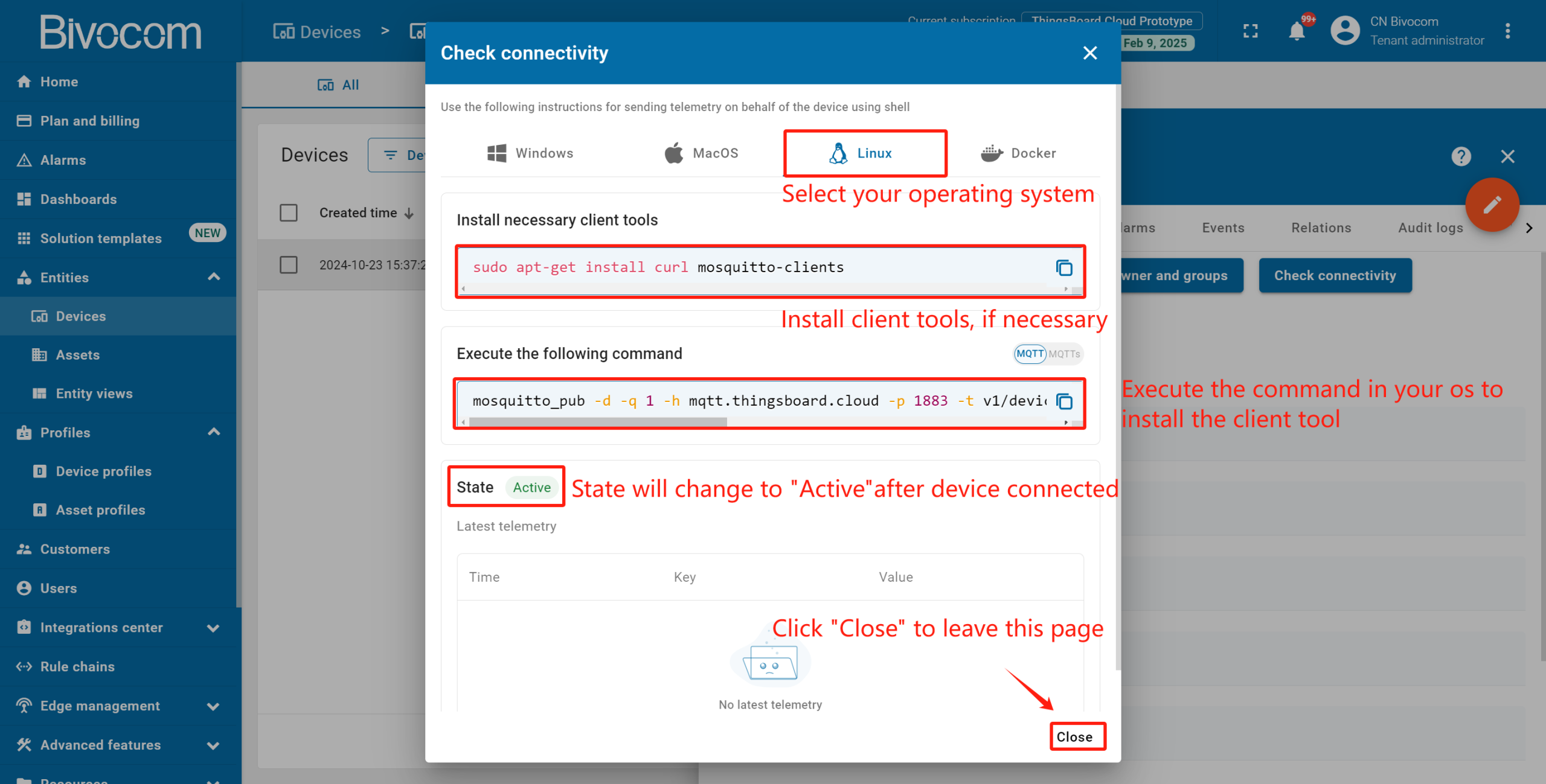 Return to your ThingsBoard, navigate to Devices. Go to the device’s detail page, and click the “Check connectivity” button. Select “Linux” as the operating system (Bivocom gateways run OpenWrt Linux) and follow the on-screen prompts (install client tools if needed). The device status will switch from “Inactive” to “Active” once the connection is confirmed.