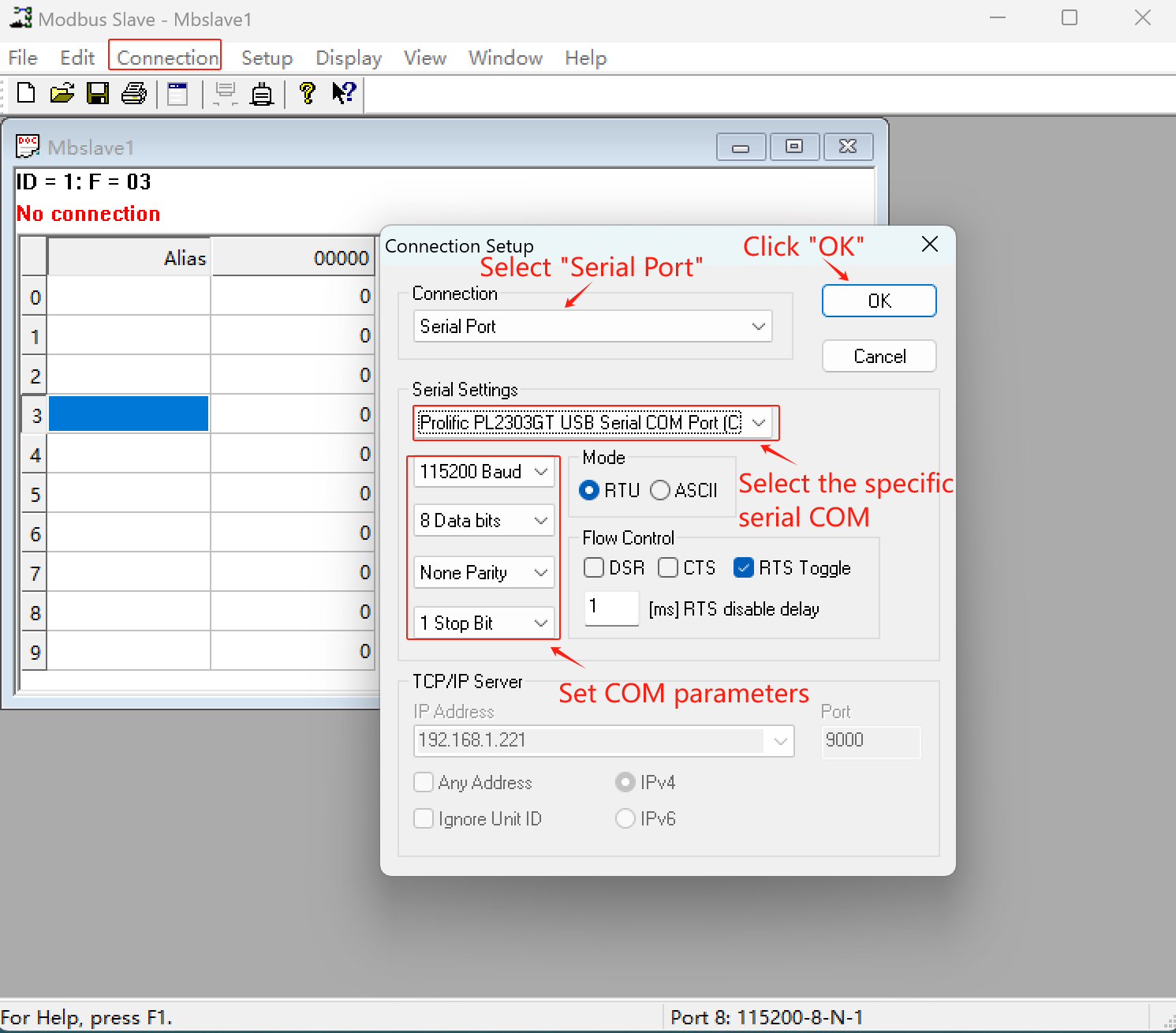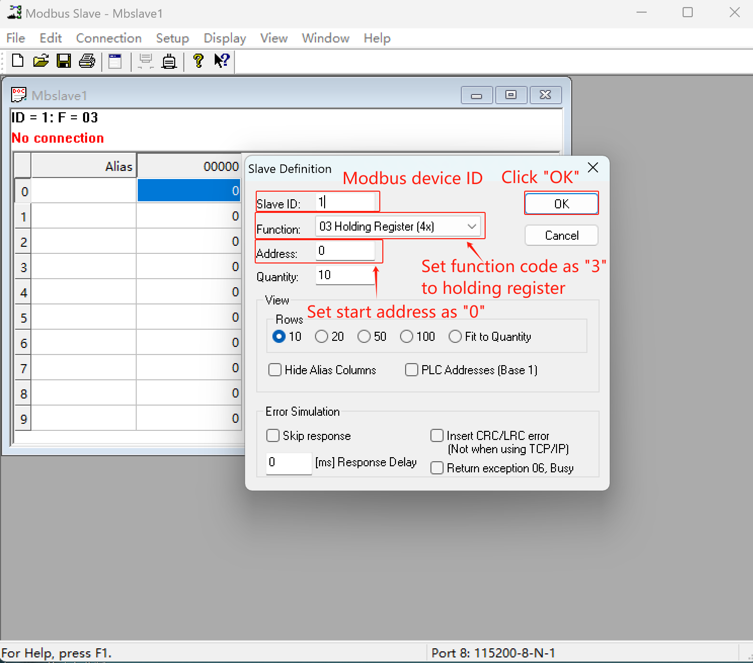 - Set Slave ID = 1, Function Code = 3 (Holding Register), and Start Address = 0 (or others as you wish). After, click “OK”.