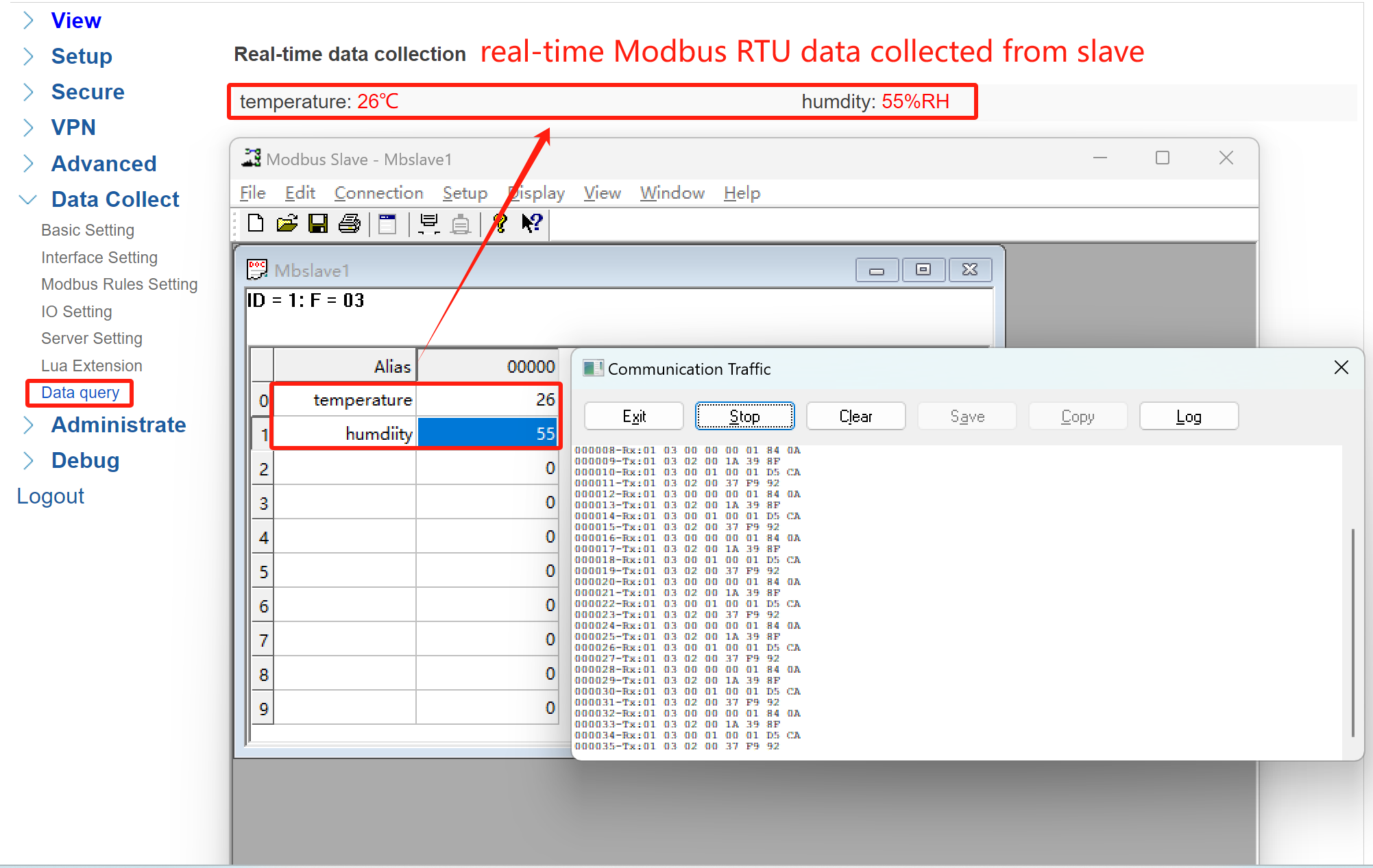 ④ Validate: Back to WEBUI of your gateway, navigate to Data Collect > Data query to view real-time collected data.