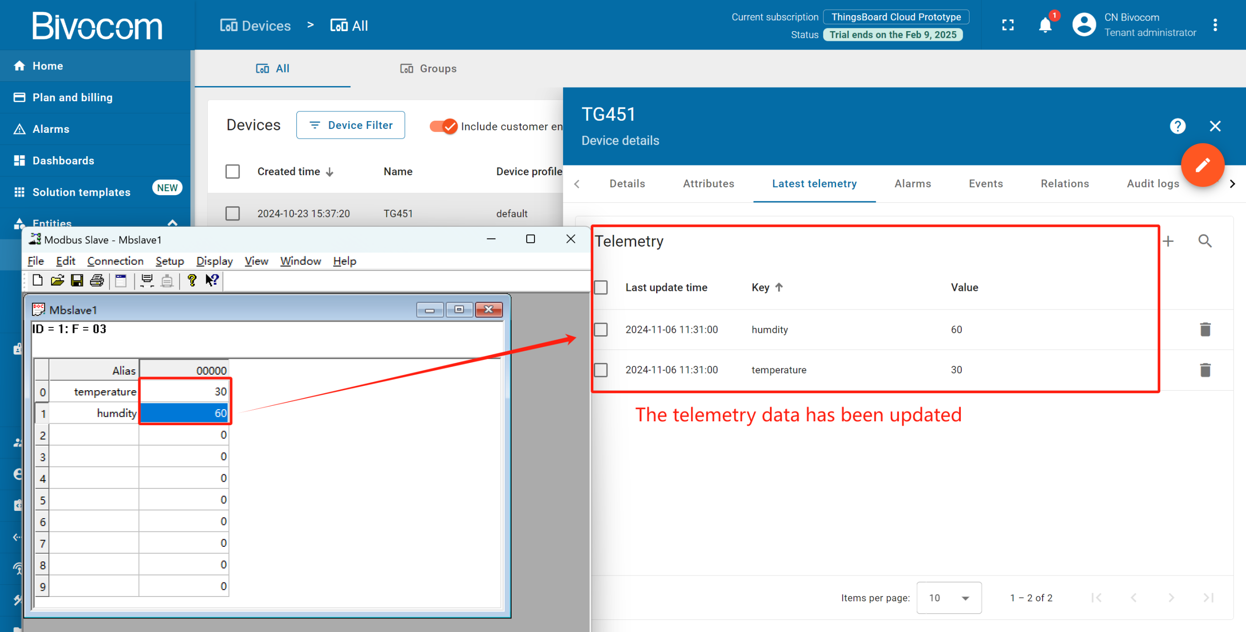 Then back to the platform, check whether the data has been updated. Get into “Device detail” page, you can see the telemetry data has been successfully changed the same as Mbslave.