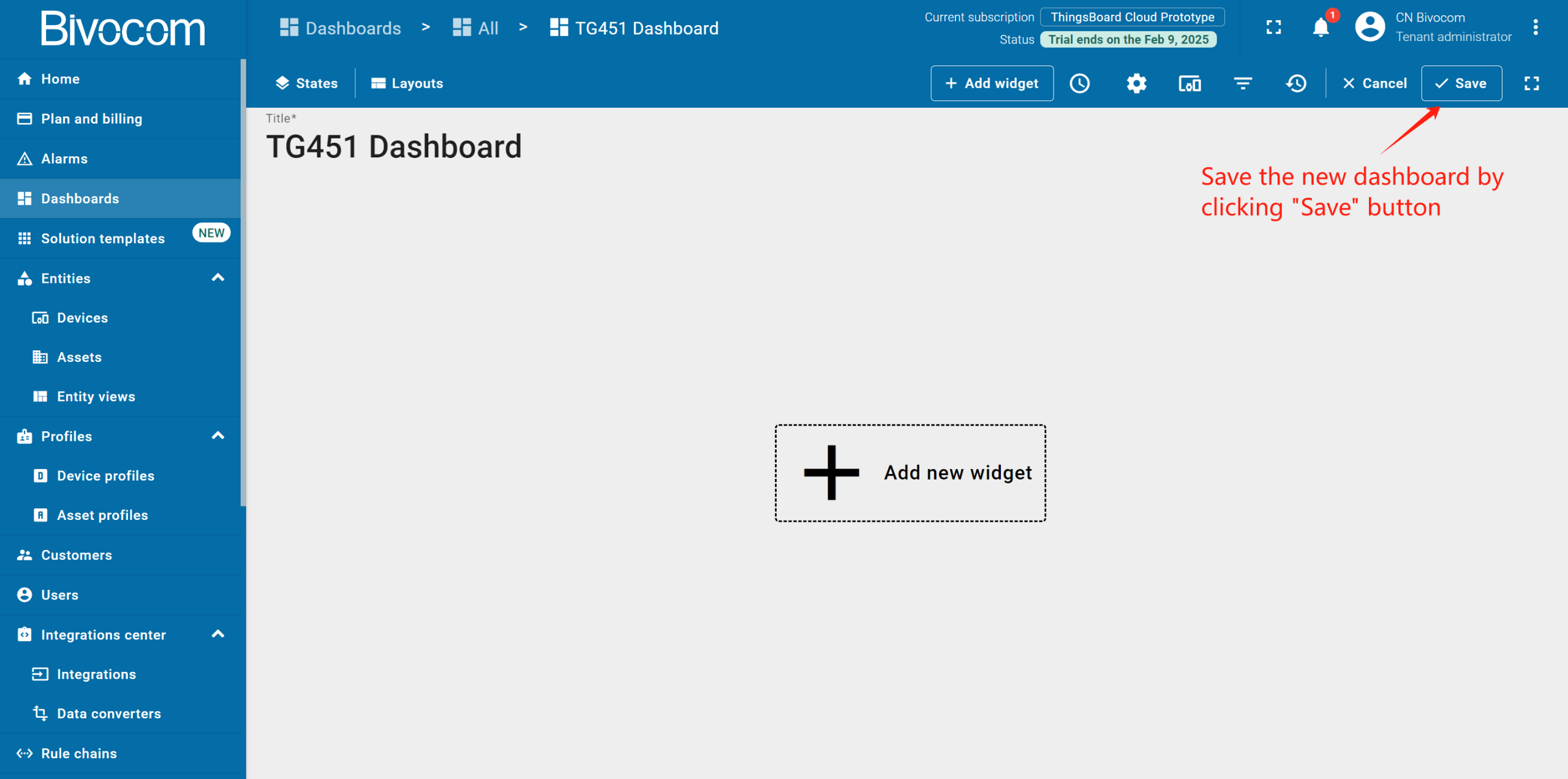Navigate to Dashboards > All. Click “+” and choose “Create new dashboard”. Enter a dashboard name (the description is optional) and click “Add”. After creating the dashboard, it will open automatically, and you can immediately start adding widgets to it. To save the dashboard, click “Save” button in the upper right corner.